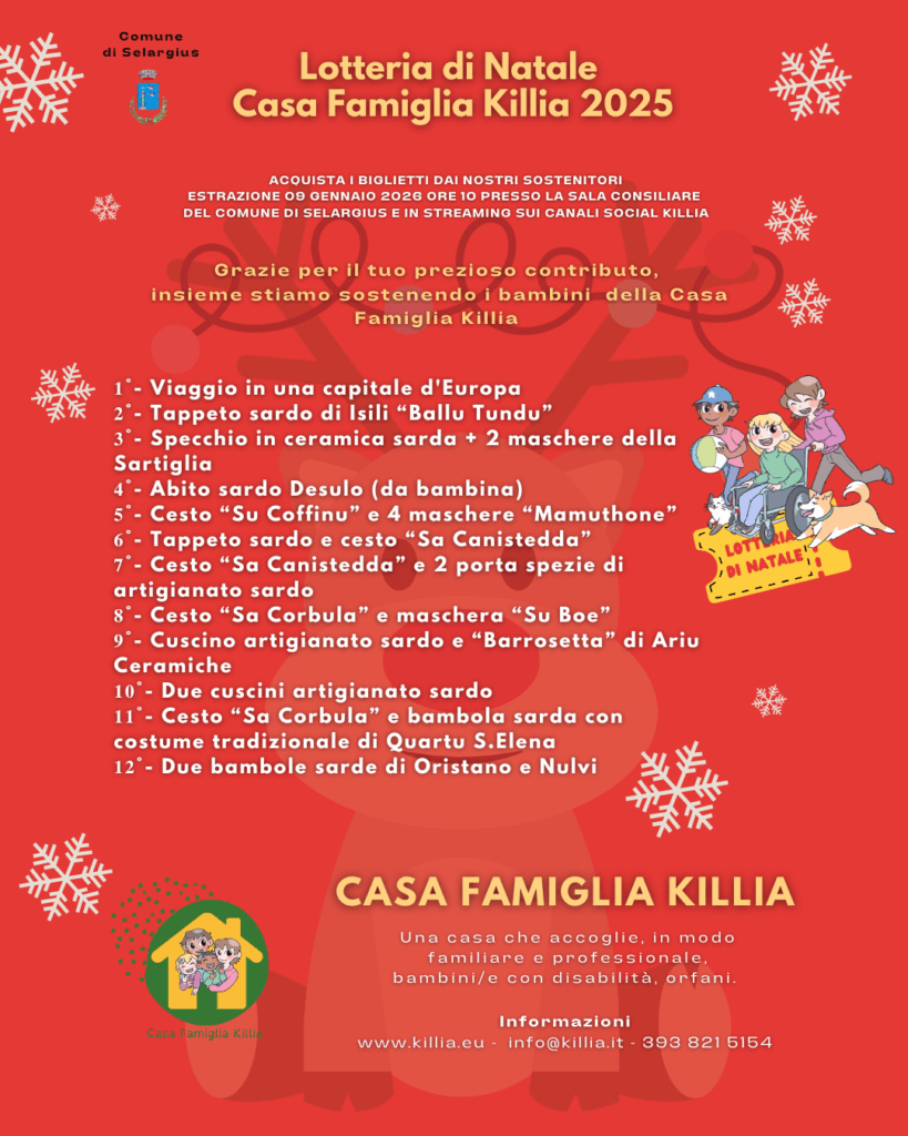 La lotteria di Natale Killia ha ottenuto il Nulla Osta rilasciato dagli Uffici dei Monopolio per la Sardegna, registro ufficiale n. 20929 del 02/09/2025, ed il Patrocinio da parte del Comune di Selargius.